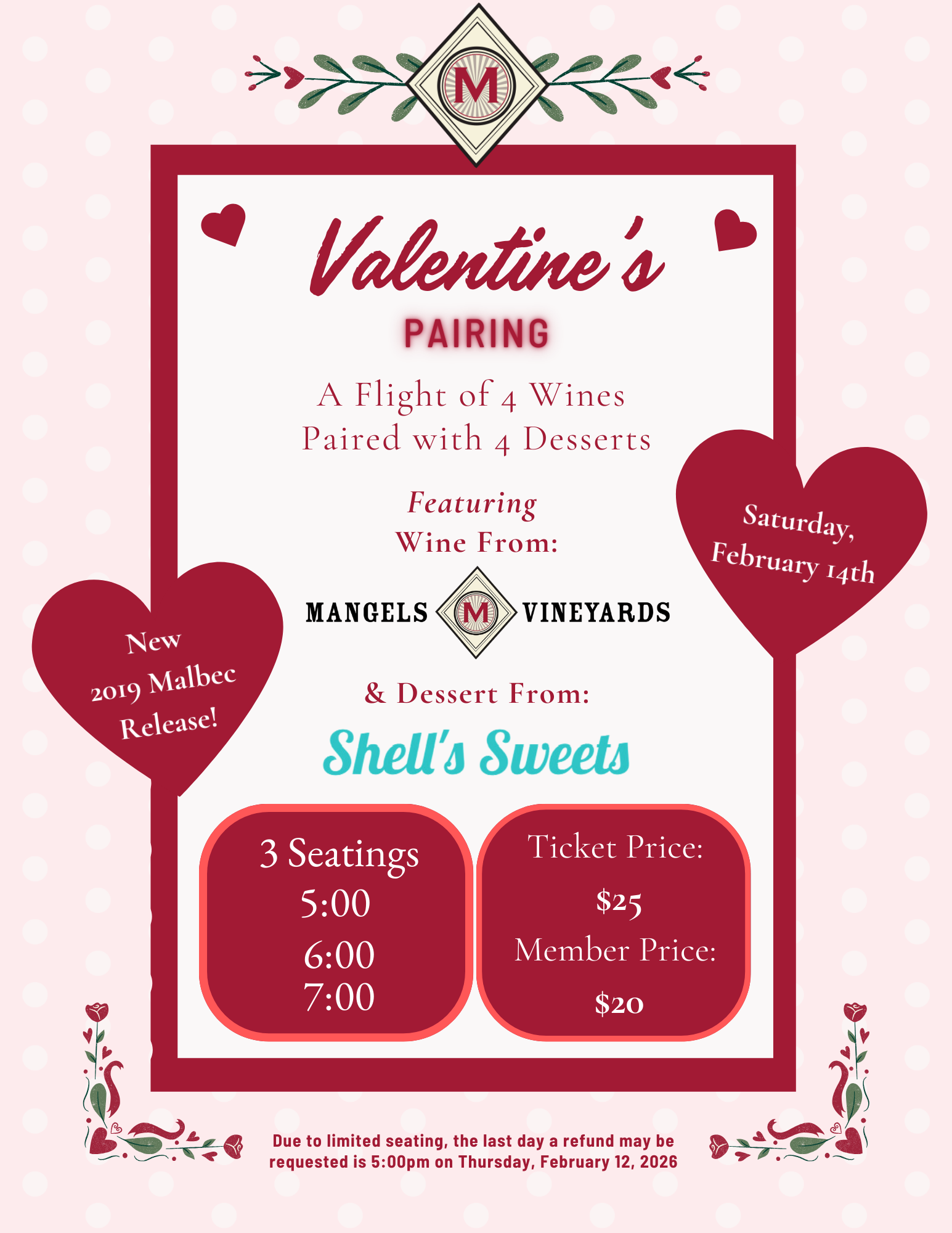 We will be featuring 4 Mangels Vineyards wines paired with 4 desserts from Shell’s Sweets.