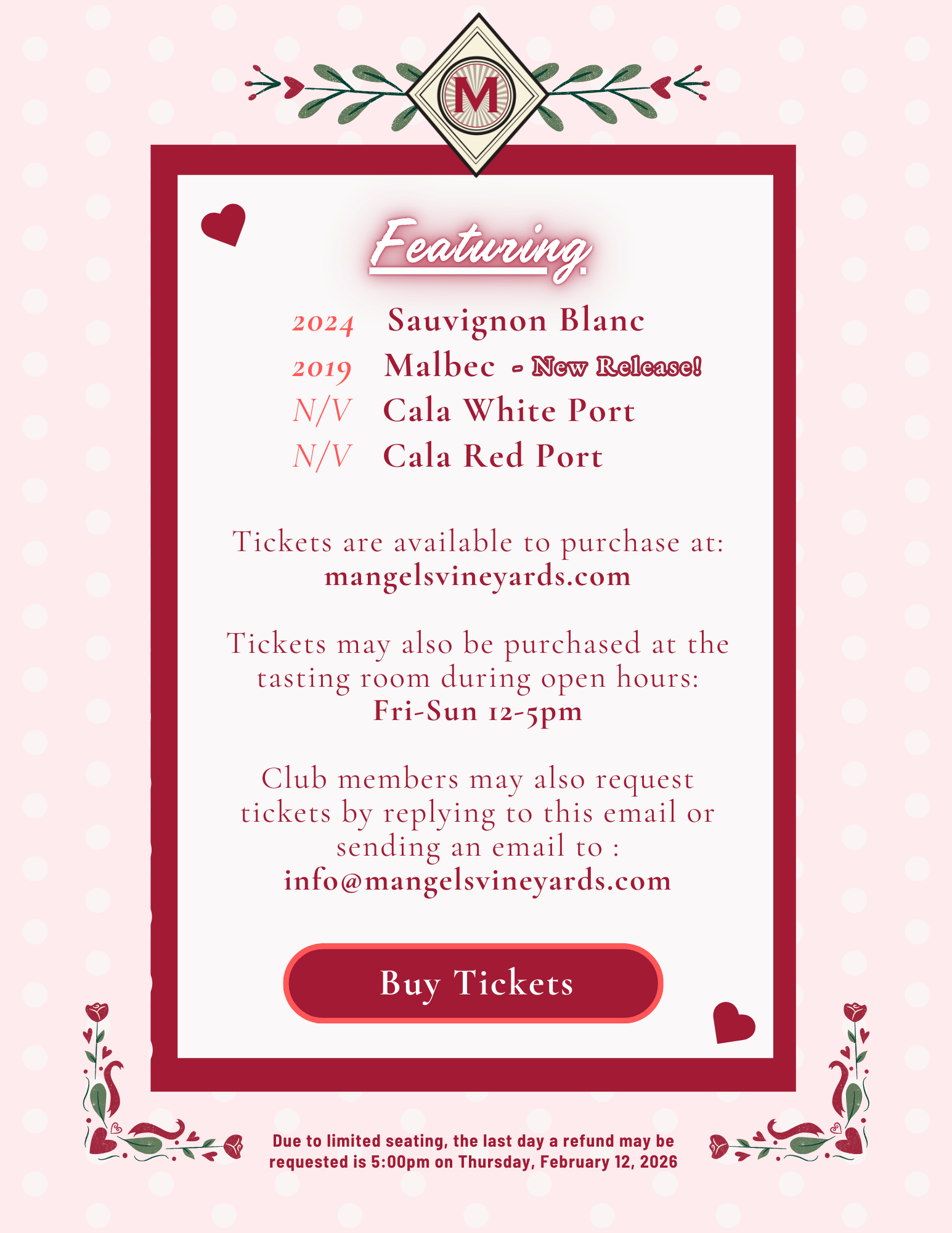 Join us on Valentine’s Day for a wonderful wine and dessert pairing!
